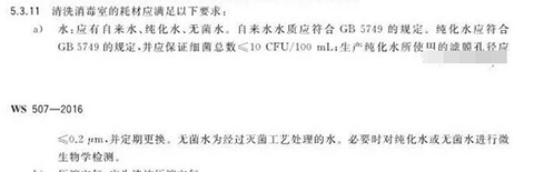 根據(jù)《WS 507—2016軟式內(nèi)鏡清洗消毒技術(shù)規(guī)范》的要求,水:應(yīng)有自來水、純化水、無菌水。其中,自來水水質(zhì)應(yīng)符合GB5749《生活飲用水衛(wèi)生標(biāo)準(zhǔn)》的規(guī)定。純化水應(yīng)符合GB5749的規(guī)定,并應(yīng)保證細(xì)菌總數(shù)≤10cfu/100mL;生產(chǎn)純化水所使用的濾膜孔徑應(yīng)≤0.2μm。無菌水為經(jīng)過滅菌工藝處理的水,必要時(shí)對純化水或無菌水進(jìn)行微生物學(xué)檢測。