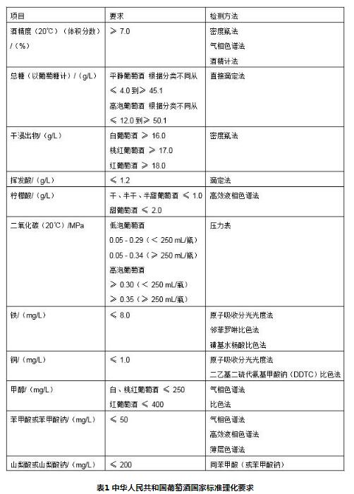 中國在2006年參考上述OIV標(biāo)準(zhǔn)推出了《中華人民共和國葡萄酒國家標(biāo)準(zhǔn)》(GB/T 15037-2006)。該標(biāo)準(zhǔn)規(guī)定了葡萄酒的定義、分類、要求和分析方法等內(nèi)容。在要求中的“理化要求”中,標(biāo)準(zhǔn)對(duì)表1所述的項(xiàng)目提出了限制: