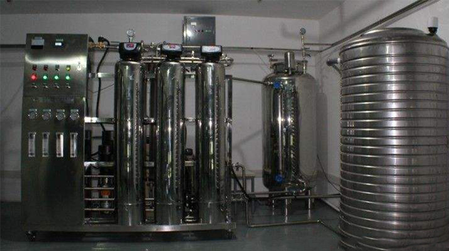 原水箱→原水增壓泵→石英砂過濾器→活性炭過濾器→軟化水器→精密過濾器→高壓泵→RO反滲透主機(jī)→中間水箱→中間加壓水泵→離子交換混床→純化水箱→增壓水泵→紫外線殺菌器→微孔過濾器→用水點(diǎn)