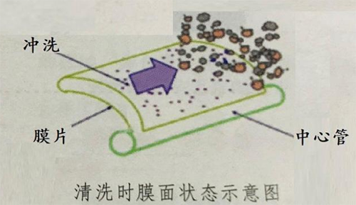 物理清洗是利用機械性的沖刷來去除膜元件的污染物,以恢復(fù)膜元件的性能,如可采用湍流、振動、水氣混合、超聲波等物理方法將吸附在膜元件上的污染物沖洗掉。如圖所示: