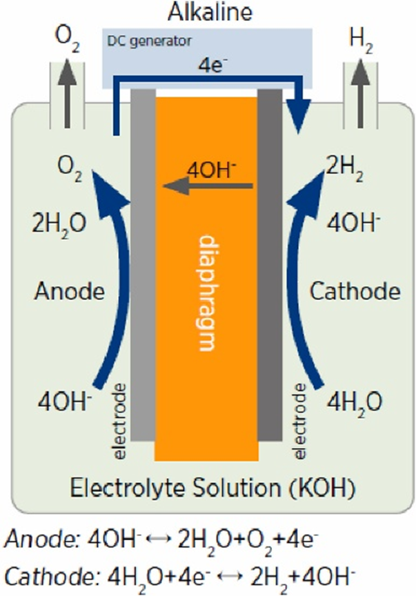 AWE是應(yīng)用最廣泛的傳統(tǒng)技術(shù),以30%-40%氫氧化鉀(KOH)溶液為電解液,采用多孔隔膜分隔兩極。