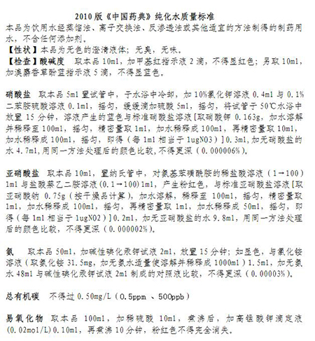 2010版中國藥典中明確指出,飲用水經(jīng)蒸餾法、離子交換法、反滲透法或其他方式制得的制藥用水,總有機碳檢測不得超過0.50mg/L(0.5ppm、500ppb)、不揮發(fā)物檢測遺留殘渣不得過1mg、電導(dǎo)率(10℃,≤3.6µs/cm),(20℃,≤4.3µs/cm),(25℃,≤5.1µs/cm),細(xì)菌、霉菌和酵母菌總數(shù)每1ml不得過100個。