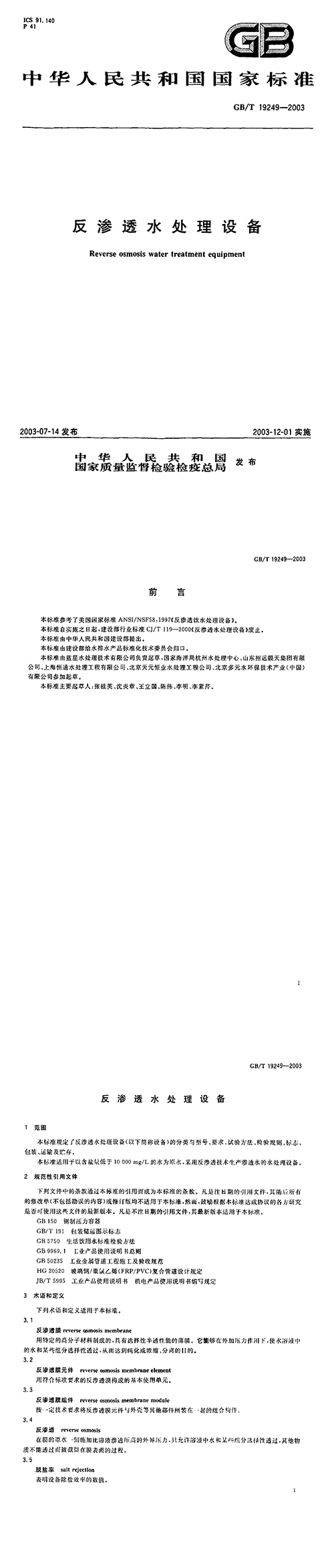 GB/T19249-2003反滲透水處理設(shè)備