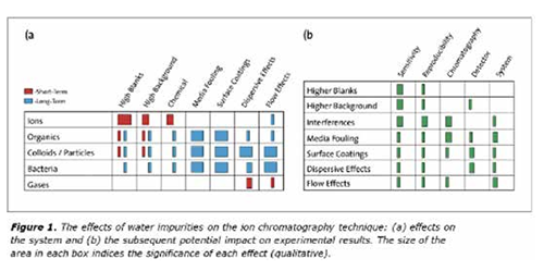 水污染的影響可能會產(chǎn)生嚴重的后果,并有可能使實驗結果無效。但是雜質(zhì)對這種分析的可靠性和再現(xiàn)性究竟有什么影響呢?如圖1所示,離子、有機物、膠體、細菌和氣體的污染影響都會在一定程度上影響靈敏度和重現(xiàn)性。離子污染物往往具有顯著但短期的影響,產(chǎn)生化學干擾,直接降低結果并降低靈敏度。離子污染物水平的波動也會導致觀察結果的更大差異。