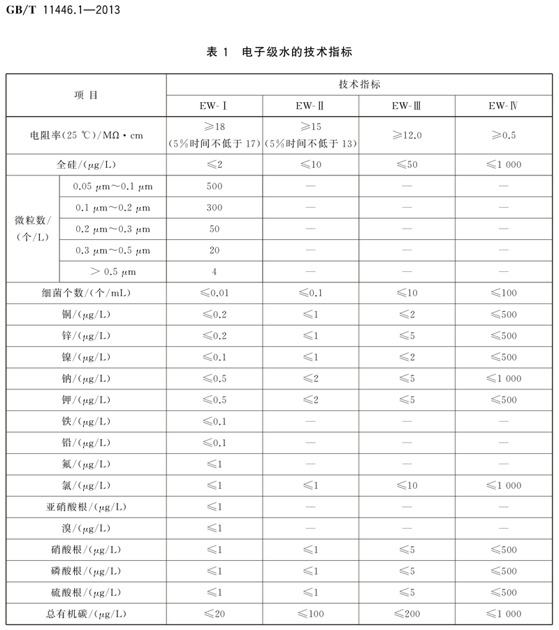 - 中國GB/T11446.1-2013電子級超純水電阻率:≥18.2MΩ.cm(25℃),全硅:≤2ppb,微顆粒物>0.05μm:500個/L,細(xì)菌個數(shù):≤0.01cfu/ml,TOC≤20ppb,金屬離子≤0.5ppb。